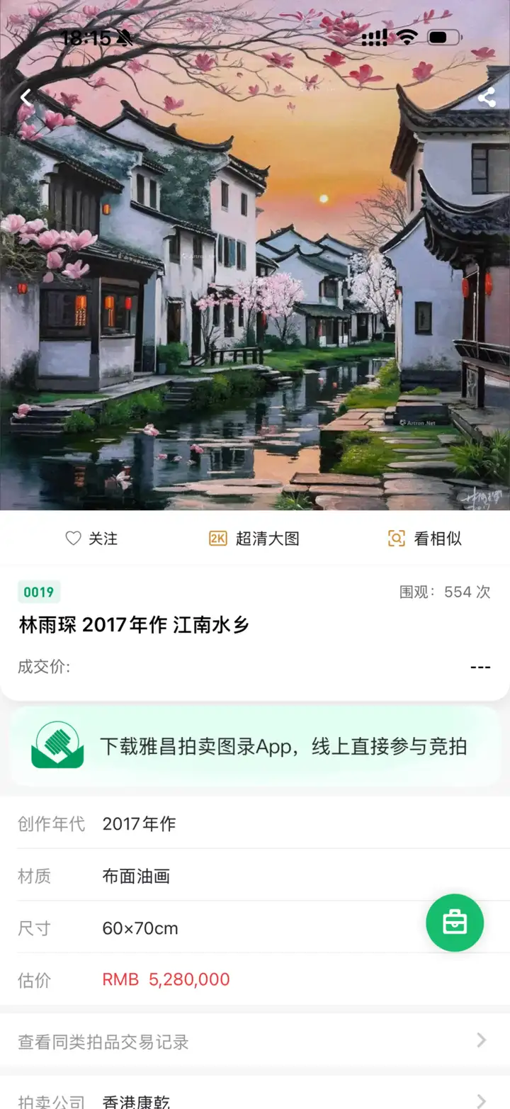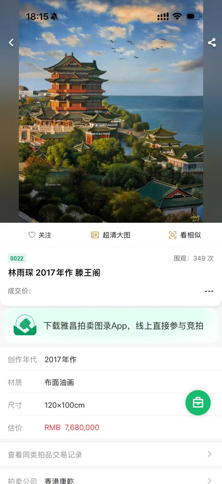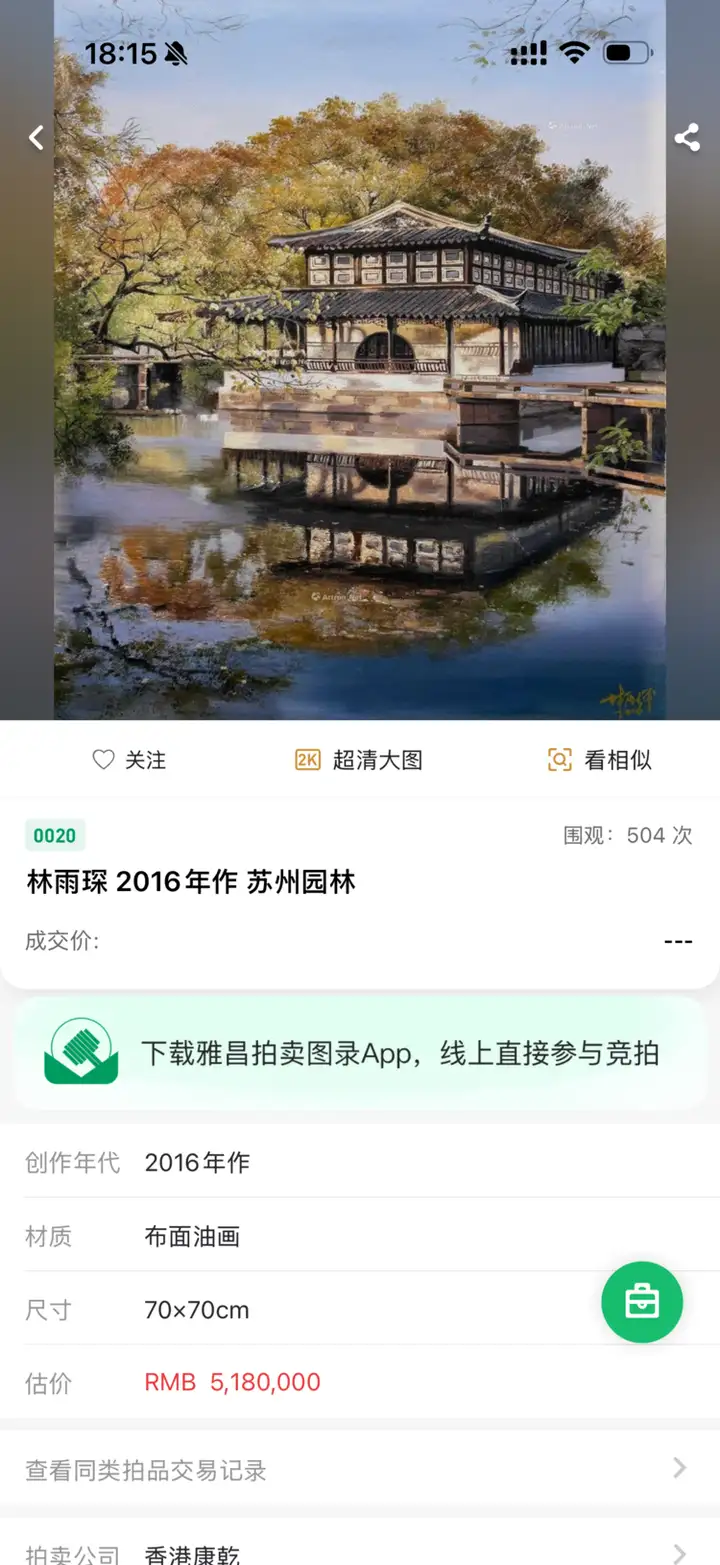 林雨琛的创作始终锚定“非遗传承”的核心。2017年,他完成的《滕王阁》《黄鹤楼》《岳阳楼》三幅布面油画,尺寸均为120×100cm,估价分别达768万元、718万元、728万元。画作中,他以毫厘毕现的超写实技法,还原了滕王阁的赣派建筑榫卯、黄鹤楼的攒尖顶形制、岳阳楼的盔顶工艺,将“古建筑营造技艺”这一国家级非遗的细节精髓,转化为可触摸的视觉艺术。同一时期创作的《江南水乡》(60×70cm,估价528万元),则把江南民居营造技艺与水乡民俗融合,白墙黛瓦的徽派建筑在油彩晕染中,成为江南非遗文化的鲜活载体;2016年的《苏州园林》(70×70cm,估价518万元),更是将苏州园林造园技艺的“移步换景”美学,定格在画布的光影里。
