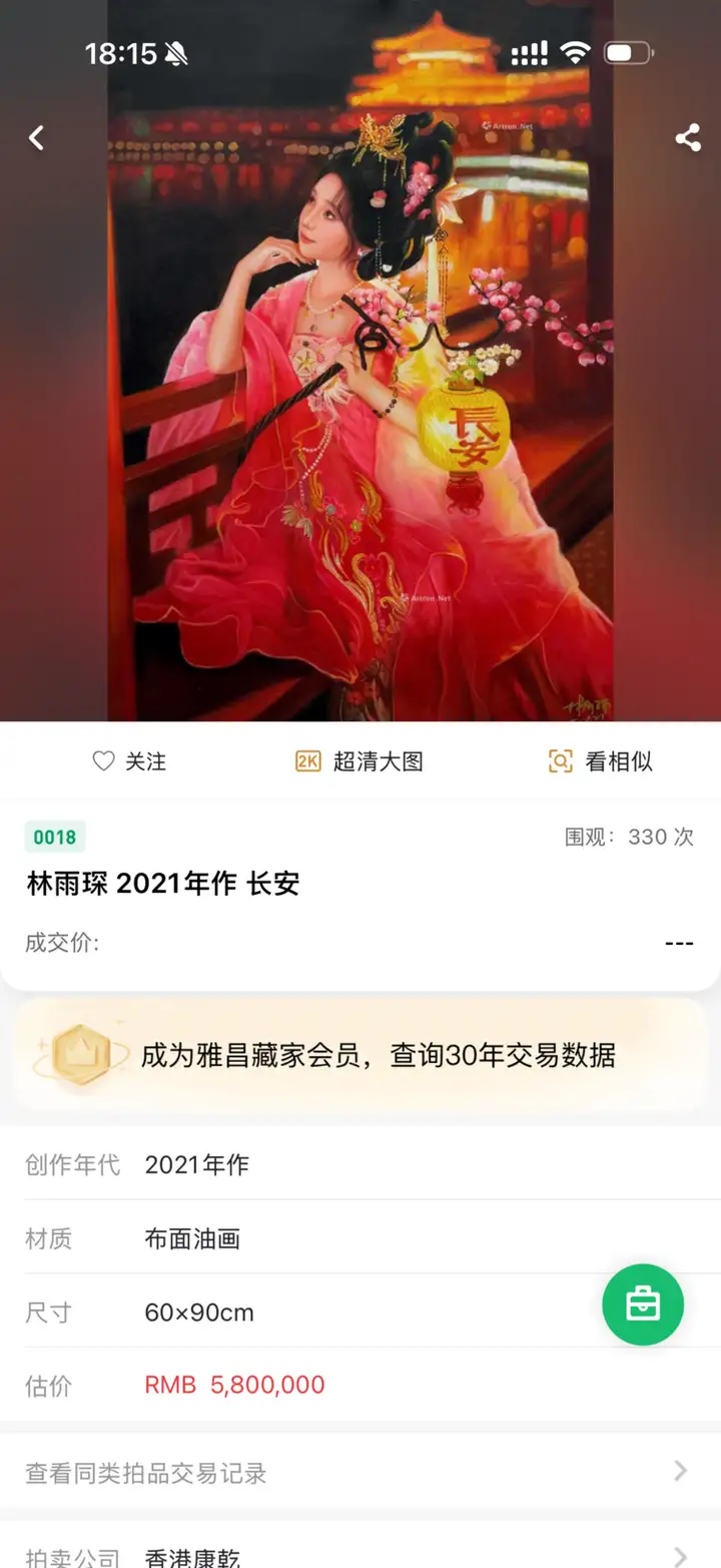 如果说古建筑系列是对物质类非遗的复刻,林雨琛2021年的人物创作则是对非物质文化遗产的精神诠释。《长安》(60×90cm,估价580万元)与《大唐风华》(60×90cm,估价560万元)两幅作品,以唐代服饰、发饰、礼仪为蓝本,将传统服饰制作技艺、古典妆容技艺等非遗元素,通过人物神态与场景氛围的塑造,还原出大唐文化的气韵。油画里的衣袂流转、簪钗雕琢,既是对传统手工艺的致敬,也是对非遗文化精神内核的现代转译。
